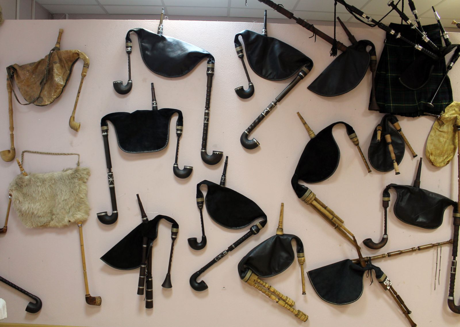 Здесь на полках лежат флейты, цимбалы, скрипки, волынки, дуды и даже можно заметить причудливый барабан из тыквы. Одна из стен полностью увешана дудами.