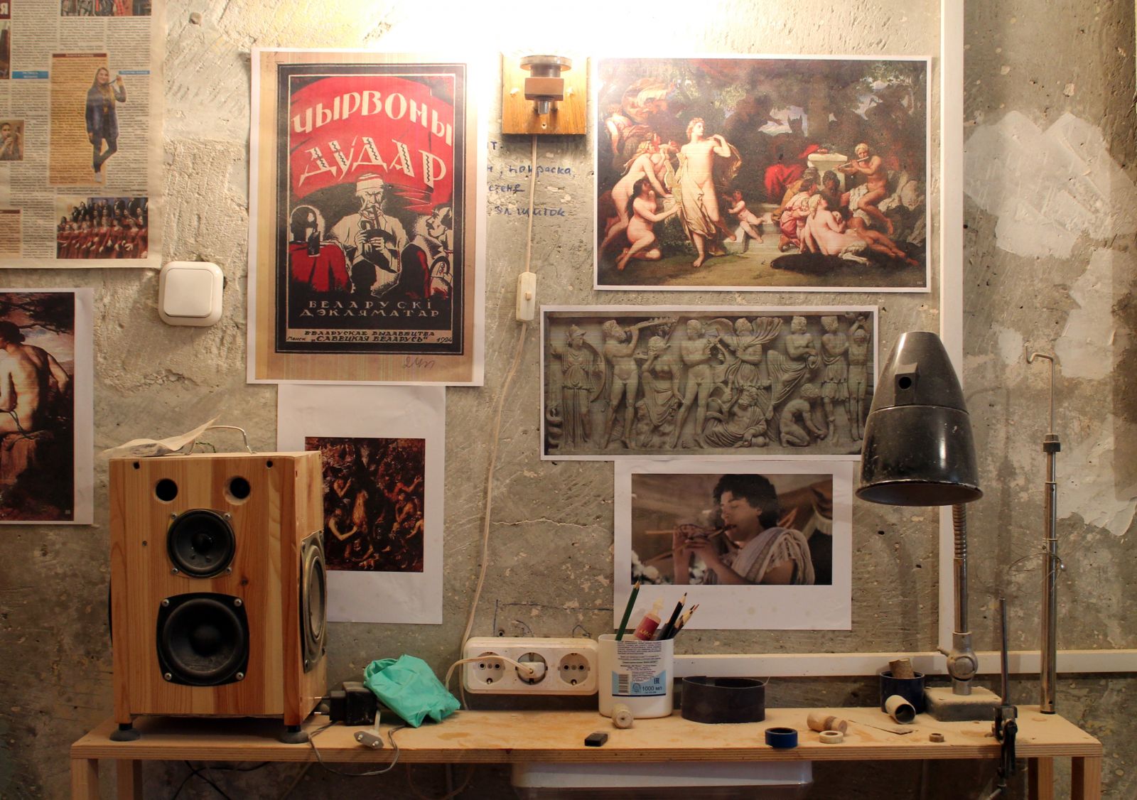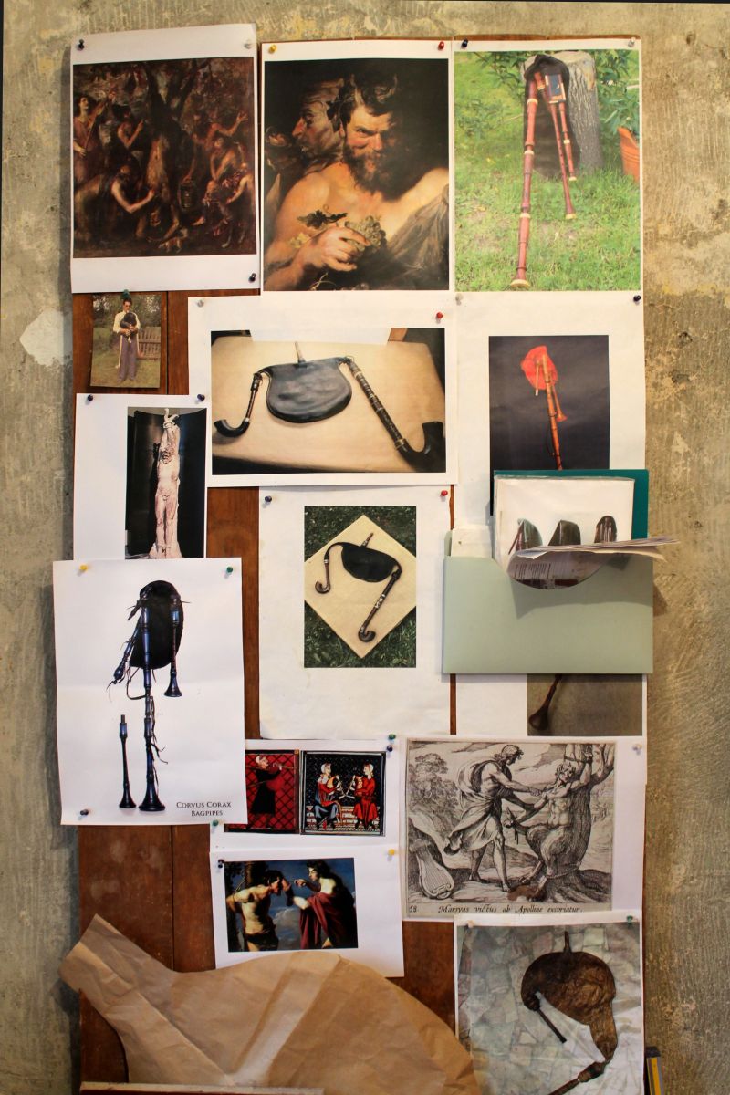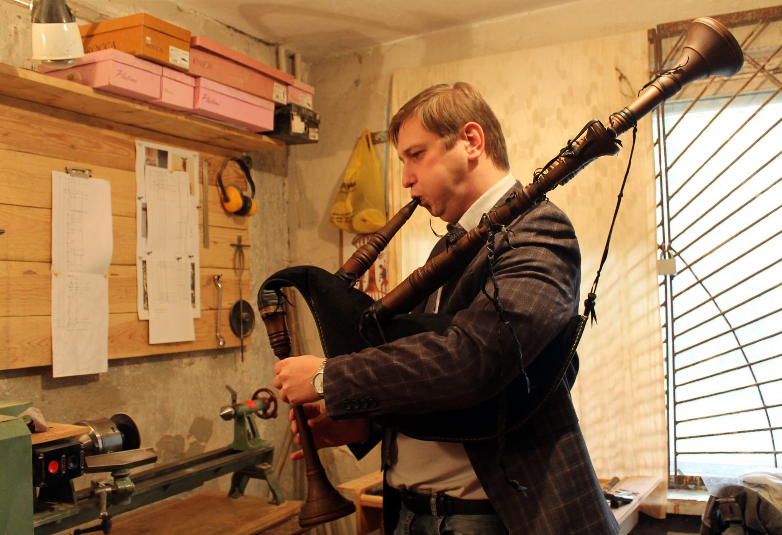 Мы покидаем экспозицию музея и отправляемся в мастерскую Александра, где рождаются эти экзотические инструменты, отсылающие нас в прошлое. В углу стоит токарный станок. На столе аккуратно разложены инструменты для работы с деревом. За дверью ждут своего часа заготовки древесины, а на стенах висят изображения волынок и репродукции картин. Мастер берет в руки дудльзак (немецкую волынку), но перед тем, как сыграть на нем, закладывает в уши вату. Через минуту помещение насквозь пронзает магический звук.