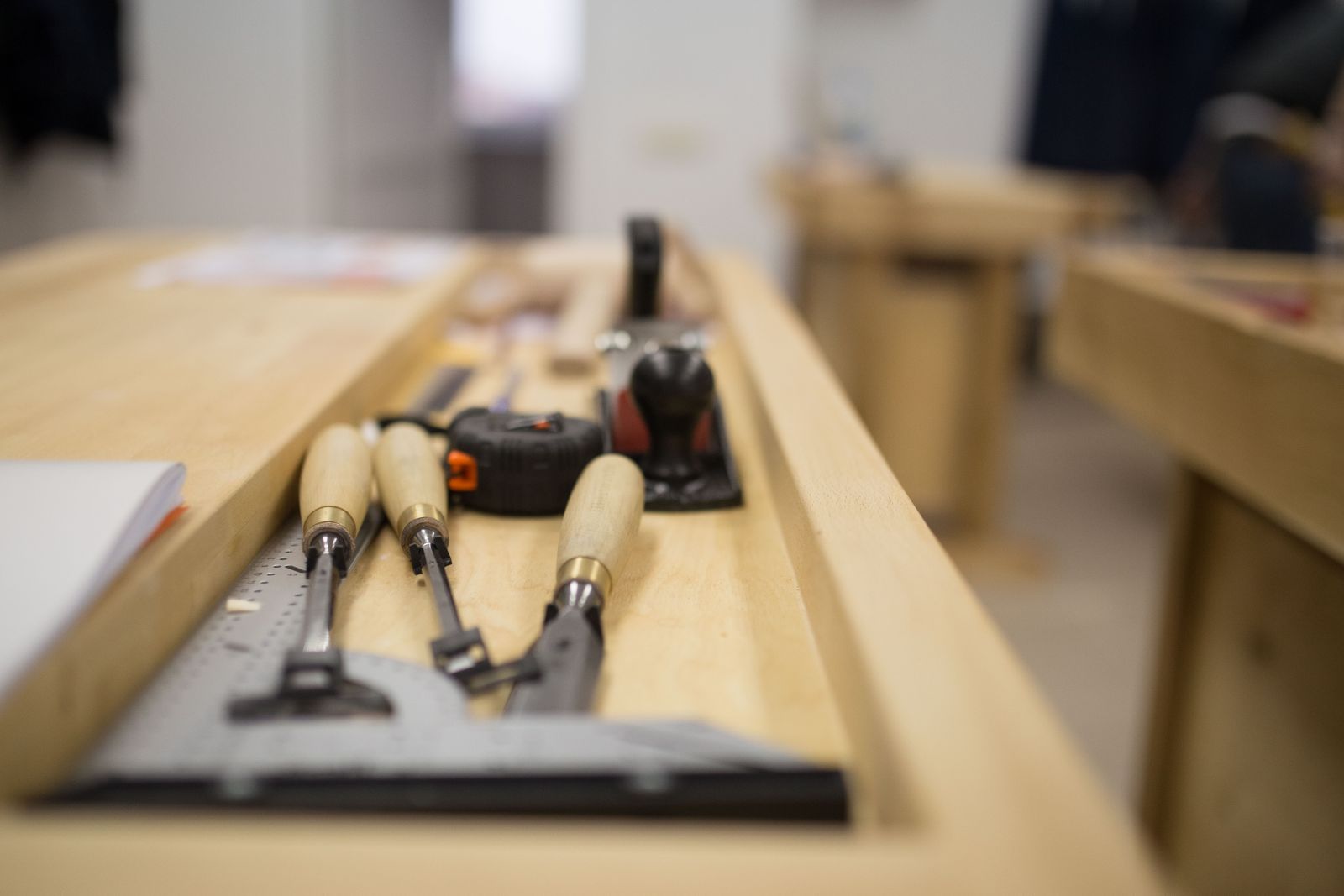 Первый инструмент – верстак. Без него крайне сложно серьезно занимаетесь столярным делом. У нас в мастерской 9 верстаков из бука, оборудованных тисками. Ученикам мы предоставляем базовый набор инструментов. Это пилы – для продольного и поперечного реза, стамески различной ширины, рубанки. Имеется разметочный и измерительный инструмент – линейки, угольники, рейсмусы, малки, разметочные ножи. Из электроинструмента ученики используют дрель-шуруповерт. В идеале использовать классическую ручную дрель в виде коловорота, но у нас все-таки современное общество и многие от этого отказываются.