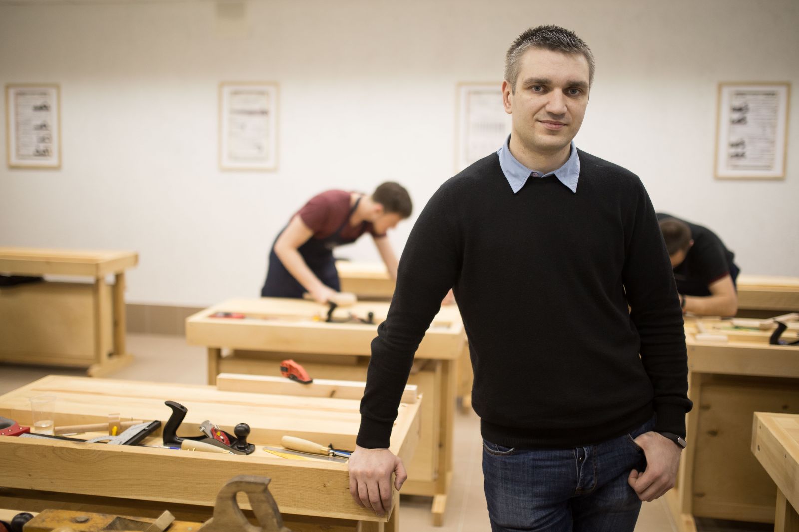 После окончания учебы я стал специализироваться в лакокрасочной отделке и занимался ей около 5-6 лет. Работал технологом по покраске в крупной российской компании «РусАвиаИнтер», занимался люксовой отделкой интерьеров самолетов и яхт для влиятельных людей. Потом вернулся в Беларусь и решил начать свое дело. Вспомнил, как во время учебы было трудно купить хороший классический столярный инструмент, начал изучать вопрос и выяснил, что и на тот момент ничего не поменялось – в Беларуси не было специализированных компаний, которые его продают. Через месяц я уже сформировал ассортимент, договорился с поставщиками и запустил магазин по продаже ручного столярного инструмента. Со временем в магазин начали приходить люди с вопросом «Где учиться?». Некоторые, покупая инструмент, не до конца понимали, как пользоваться им правильно.