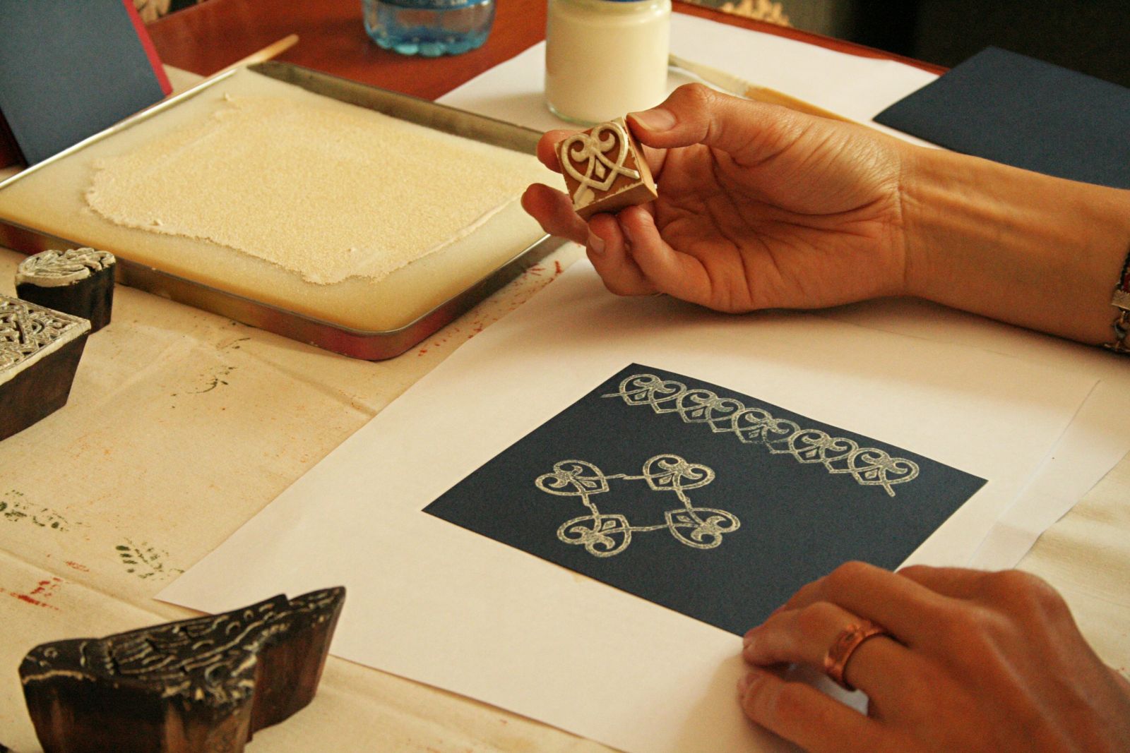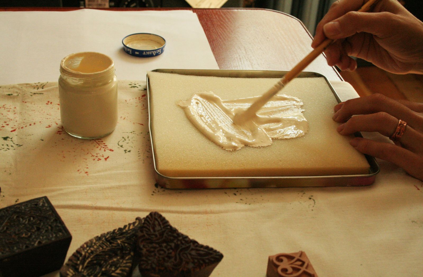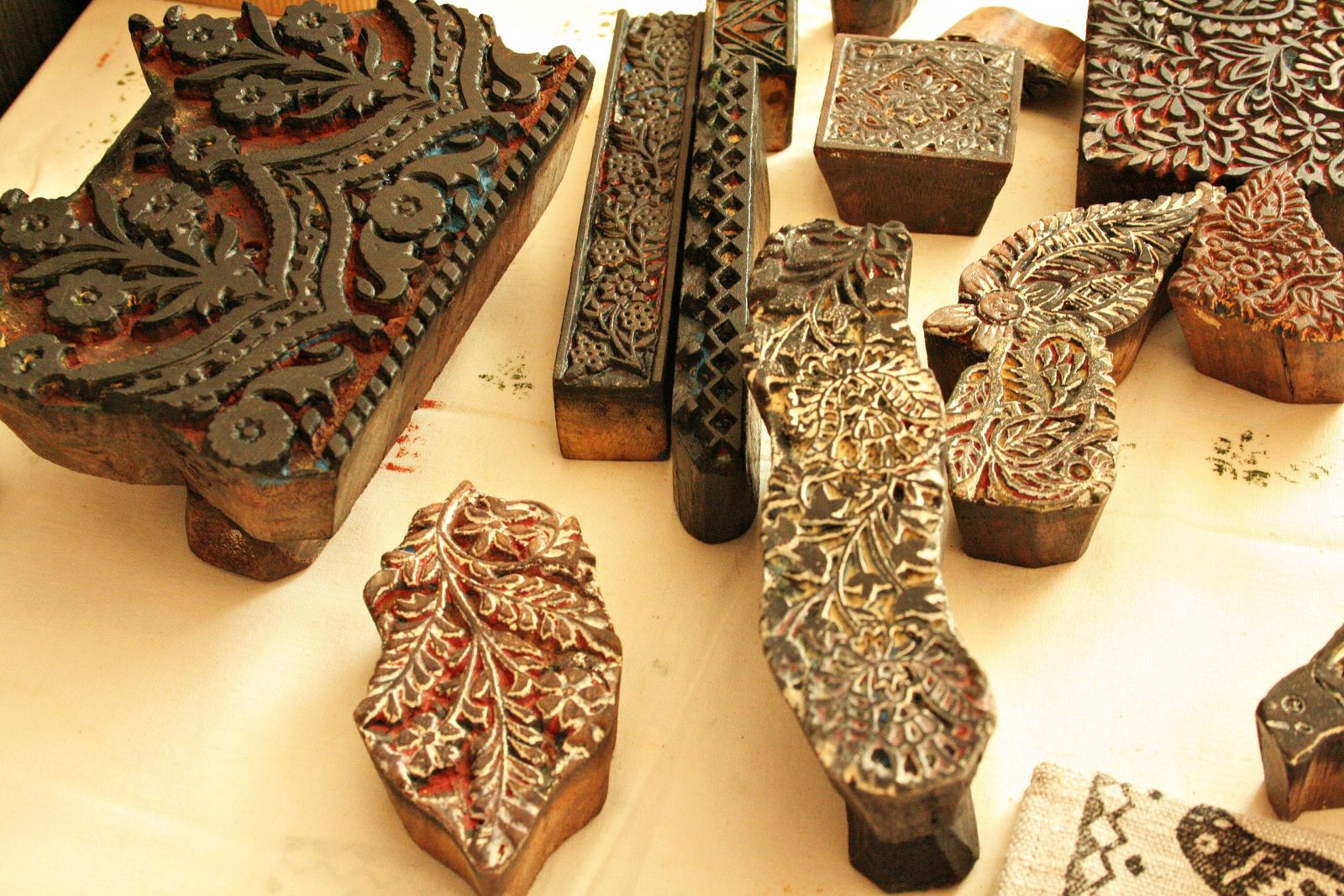 Індыйскія штампы робяцца з дрэва, якое добра ўбірае і аддае фарбу. А гэты пакуль невядома, як будзе сябе паводзіць. Я бачыла некалькі прыкладаў традыцыйных набіваных тканінаў у кніжках. Магу сказаць, што беларускія дошкі, відаць, былі досыць сціплыя і стрыманыя, не стракатыя, не віціеватыя ў адрозенні ад індыйскіх. У іх жа набіваныя тканіны вельмі папулярныя і выкарыстоўваюцца ў традыцыйным адзенні. Але да вопраткі ў мяне пакуль справа не дайшла. Не стае часу.