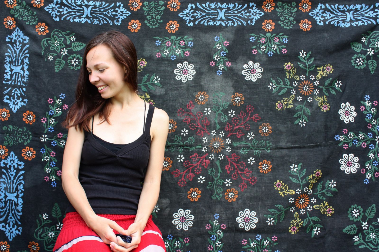 Я люблю выкарыстоўваць тканіну натуральную. Бо калі ўзяць сінтэтычную матэрыю, яна мае слізкую паверхню, а за яе фарба будзе кепска чапляцца. Тут я брала даматканую тканіну, яна мае грубую структуру і выразную фактуру. І на ёй фарба чапляецца толькі за паверхню, не пранікае ў глыб валокнаў. Можа, гэта не самы лепшы варыянт, бо ў асноўным фарба мацуецца толькі зверху. А крамны лён, бадай, самы лепшы варыянт, бо ён досыць гладкі і лепш убірае фарбу. Яшчэ я спрабавала набіваць на віскозу, мне спадабалася.