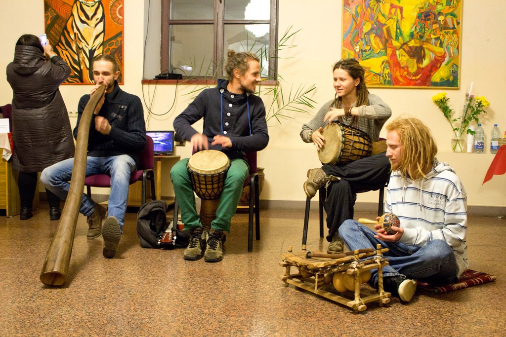Так же Катя немного рассказала, про музыкантов, и необычные музыкальным инструменты, которые можно было увидеть и послушать на презентации выставки - «Диджириду - инструмент австралийский, но с африканским барабаном джамбе звучит отменно, вот я и позвала двух моих хороших друзей Фёдора Сташкевича и Евгения Шестака с этими инструментами поэксперементировать на открытии. Ещё один экзотический инструмент - африканская маримба - моя личная. Получилось действительно магически!»