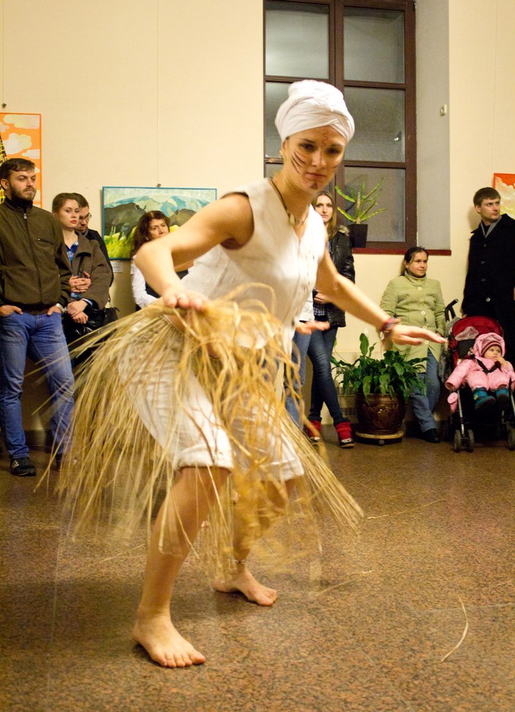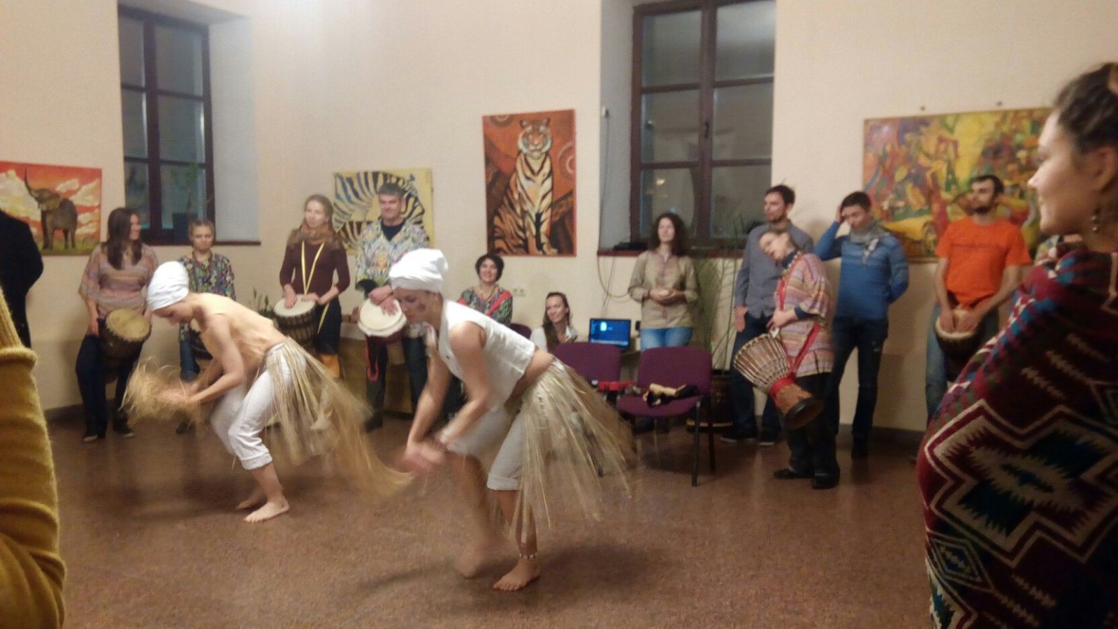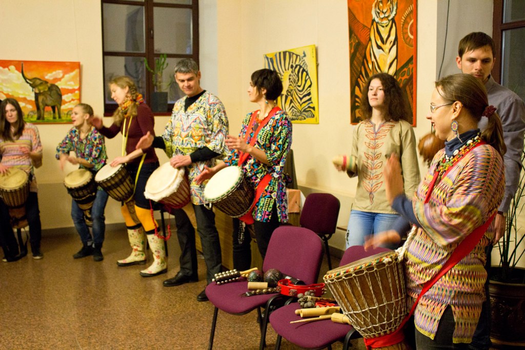 25 октября «Клуб Мастеров» побывал на жарком открытии выставки живописи «Солнце Африки» - совместный проект Екатерины Кулешевич и Виктории Черноокой. Кинотеатр «Победа», где разместилась экспозиция, буквально гудел и искрился на протяжении трёх часов от танцующих ног, барабанных ритмов, светлых глаз и горячих сердец. Чистый ритм жаркого лета захватывал всех присутствующих буквально с порога. Мы прибыли как раз, когда барабанили свои безудержные ритмы ребята из «Текадум» - школы африканских барабанов. К слову сказать, мы не упустили возможность приобщиться к танцам, чему очень рады. А потом в свои руки действо взяли «богини» из школы танцев «Кандела». Двигались они по-кубински красиво, но в итоге хоровод получился очень даже белорусский.