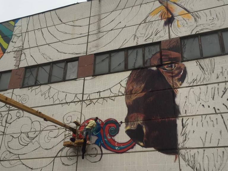 Новый рисунок площадью 3 456 м2 появится на стене пятого корпуса завода МЗОР на Октябрьской, 19 и будет посвящен охране исчезающих видов животных. «Перед началом фестиваля я успел побывать в минском зоопарке и был просто поражен могуществом зубра», — поделился первыми впечатлениями от белорусской столицы художник. Тема любви к животным Рамону, кстати, очень близка: в своем частном доме в Сан-Паулу он держит котов, собак, кур, овец и лошадей, многих из которых граффитист забрал из приюта.