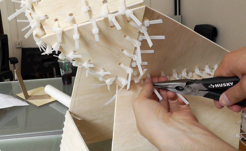 Чтобы придать стулу нужную форму, нужно постепенно затягивать хомуты. Этот процесс потребует терпения, но есть и хорошая новость в случае ошибки «неправильный» хомут легко откусывается с помощью кусачек и длинногубцев.