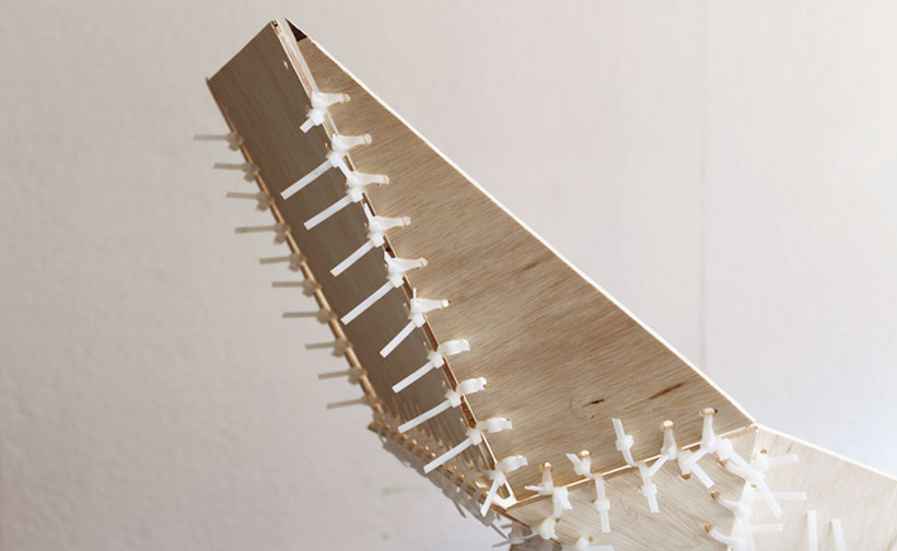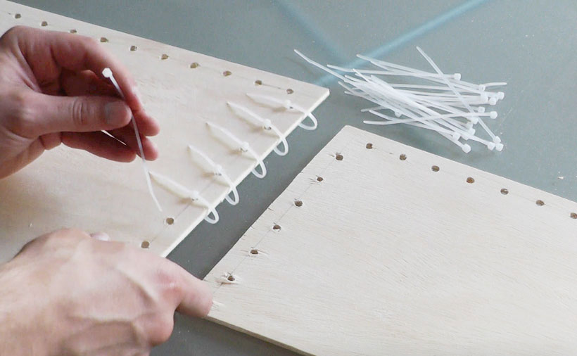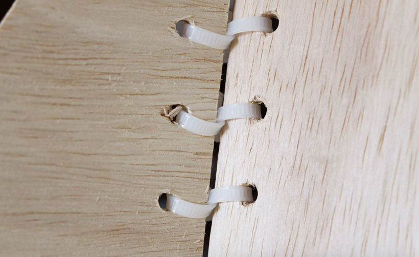 Начинаем «сшивать» детали вместе. Делаем «петельку» т.е. продеваем хомутик через отверстие и сразу защёлкиваем. Ещё один хомутик продеваем через отверстие другой детали и готовую «петельку». По такому принципу соединяются все детали.